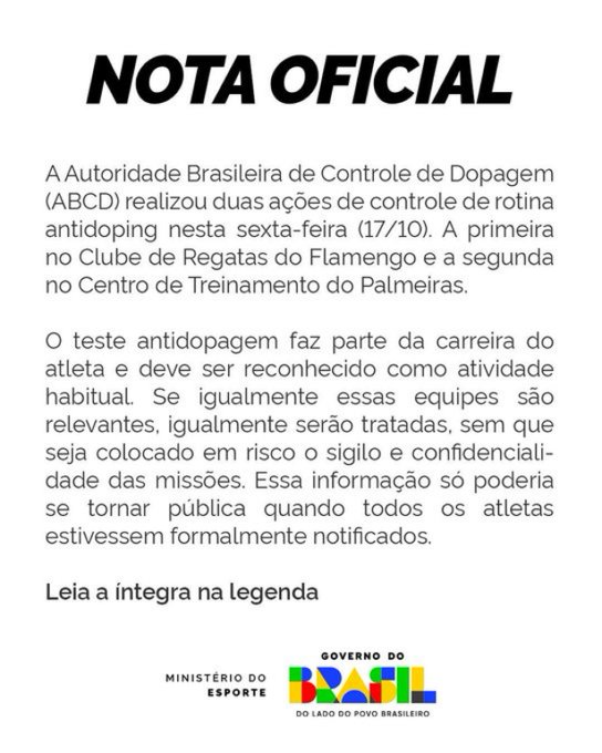 O Mengão soltou uma nota oficial, reclamando que o treino na parte da manhã foi atrapalhado por conta dos exames. No entanto, é necessário ressaltar que o Palmeiras também teve seus atletas testados na parte da tarde, igualando a situação e dando fim as teorias conspiratórias.