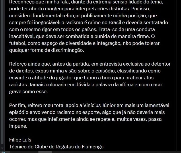 O Flamengo se prepara para a reta final da temporada, em que o Mengo irá pelo pentacampeonato da Copa Libertadores da América. E o Mengão terá de se refazer internamente devido a proporção enorme e estratosférica da fala de Filipe Luís, que mais cedo ‘relativizou’ o racismo sofrido por Vini Jr., falando em ‘caso isolado’.