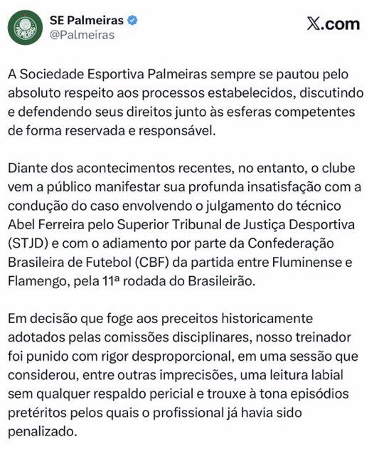 O Alviverde soltou uma nota condenando o adiamento do clássico de sábado para domingo, o que permitiu que o Fla tivesse um dia a mais de treino e de descanso para o jogo diante do rival de Laranjeiras.