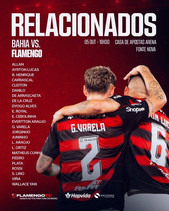 A provável equipe que vai a campo na Fonte Nova é: Rossi; Varela (Royal), Danilo, Léo Ortiz e Ayrton Lucas; De La Cruz, Jorginho e Arrascaeta; Plata (Carrascal), Samuel Lino (Everton Cebolinha) e Pedro.