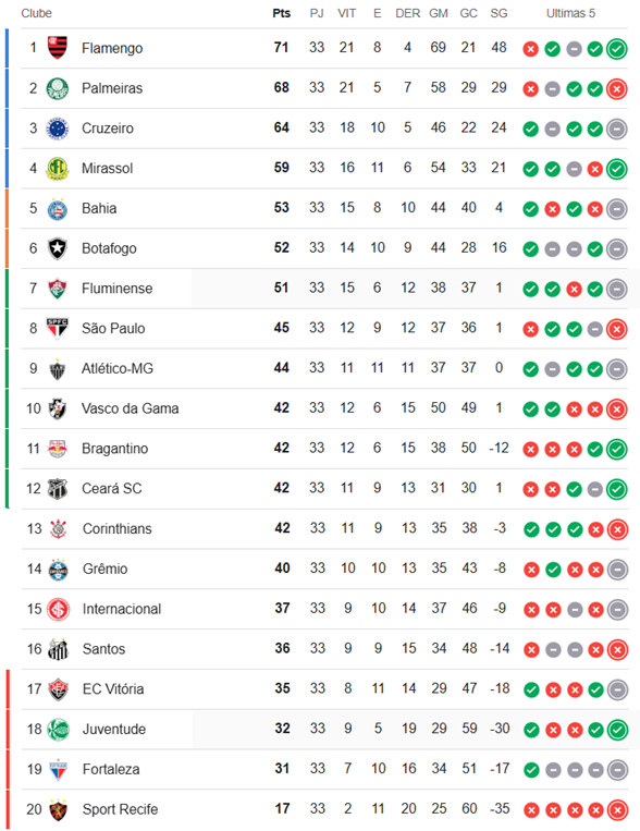 O gol do Peixe foi comemorado como um título no Rio de Janeiro. Com o tropeço do rival, o Flamengo reassumiu a liderança isolada do Brasileirão com 71 pontos, abrindo três de vantagem sobre o Palmeiras (68), a cinco rodadas do fim.