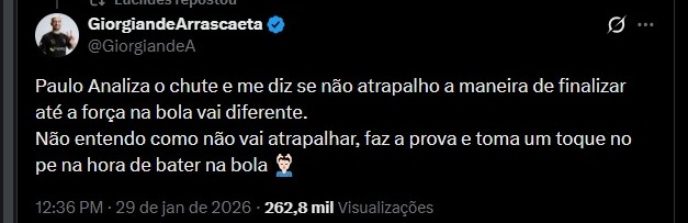 Nas redes sociais, Arrascaeta se manifestou sobre a não marcação da infração a favor do Mengão. Ele justificou o contato sofrido e afirmou que o atrapalhou, dizendo que foi o que lhe impediu de marcar o gol diante dos são-paulinos.