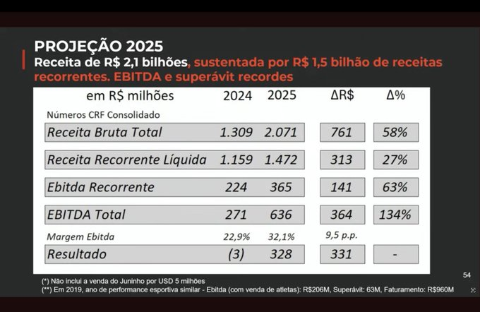 “O Palmeiras gastou R$ 700 milhões. Gastou muito e fez muito ponto, brigou com a gente até o final. Vamos corrigir essa rota e não vamos deixar ninguém gastar mais do que a gente no Brasil em nenhuma janela. Agora temos dinheiro para isso. Não pode errar três janelas seguida, mas duas pode. Vamos acelerar, se errar na primeira janela tem a segunda. Se errar na segunda eu demito e contrato alguém novo para ter um novo tipo de erro. Mas dinheiro a gente tem, não pode deixar isso acontecer. Isso é um fenômeno das SAFs e das Bets no Brasil. Você recebe um caminhão dinheiro, em vez de pagar as dívidas como fizemos contrata dois ou três jogadores”